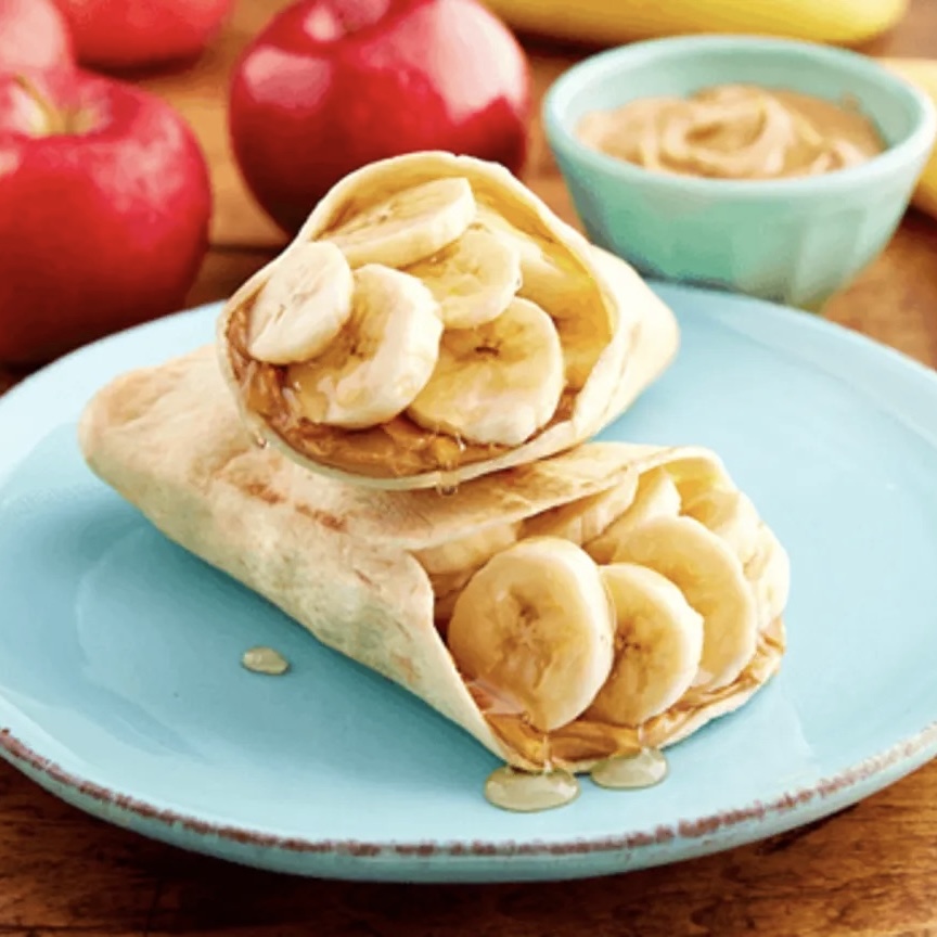 Une recette de fun, à rouler comme un vrai taco. Base de wrap ou crêpe, banane tranchée, un filet de beurre de cacahuète, quelques pépites de chocolat noir.